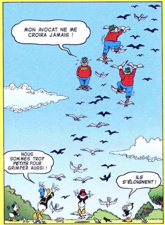 Les Rapetou escaladant des pigeons immobilisés devant Donald et ses neveux, impuissants.