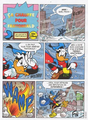 Fantomiald fait sa ronde de nuit mais il neige. Heureusement, Géo a doté son costume d'un système thermo-adapteur mais cela met le feu à son costume...