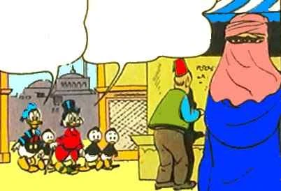 Balthazar Picsou et ses neveux dans une rue d'Égypte.
