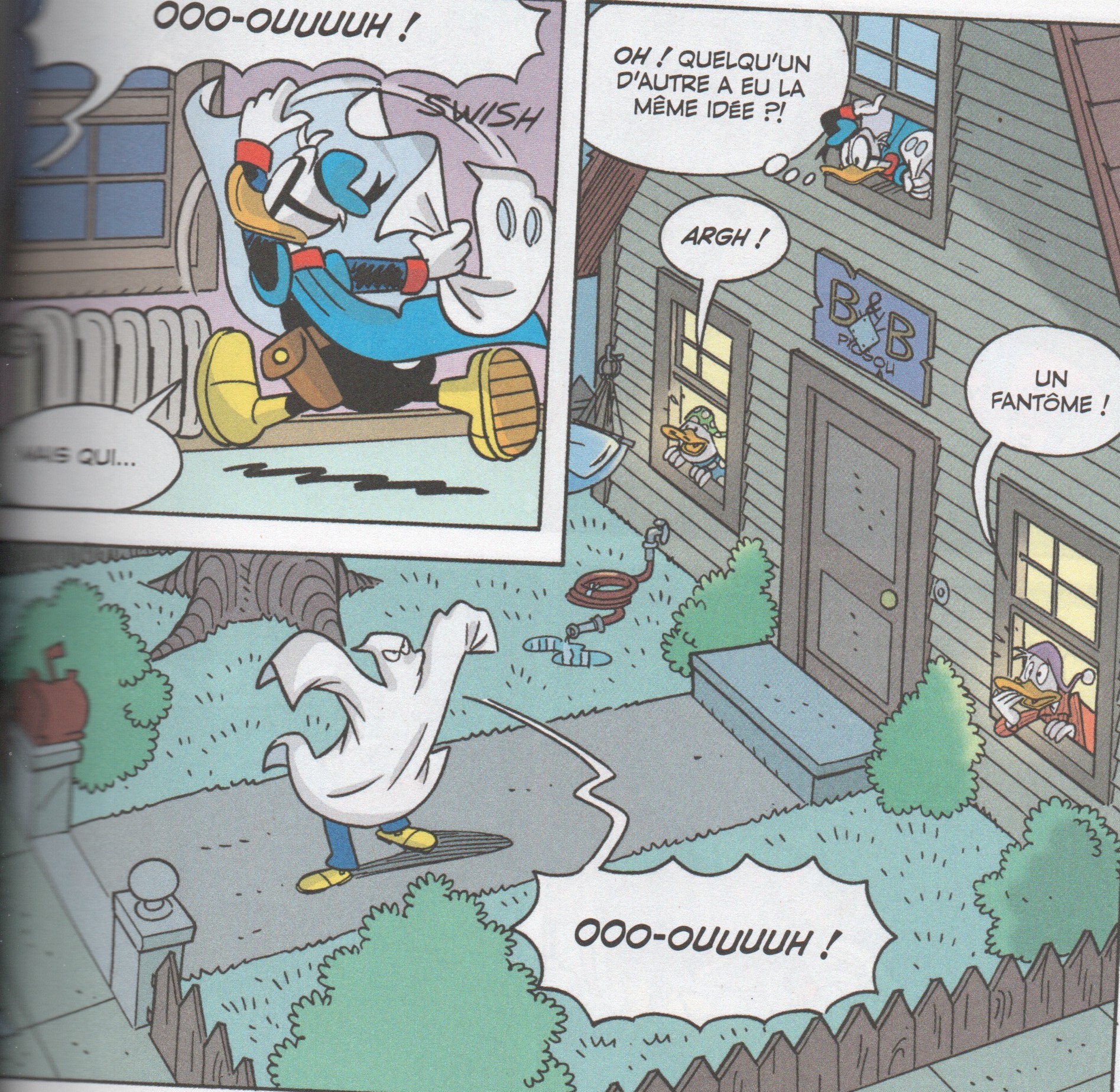 Picsou en a assez que Donald ne paye pas son loyer, Gontran lui propose alors de transformer la maison en B&B : ainsi, des hôtes couchent chez Donald. Celui-ci refuse catégoriquement le choix de son oncle. Picsou nomme donc Gontran gérant du B&B et ordonne à Donald de quitter la demeure dès le lendemain. Donald est décidé à se venger, pendant la nuit il se rend dans son repère secret et enfile son costume de Fantomiald ainsi qu'un costume de fantôme par dessus. Mais en regardant par la fenêtre il aperçoit un autre fantôme qui terrorise les hôtes. Gontran est persuadé que c'est Donald. Pendant ce temps, Donald cache son costume de fantôme et toujours sous l'identité de Fantomiald, va à la poursuite du fantôme qui s'enfuit, pour s'avoir son identité.