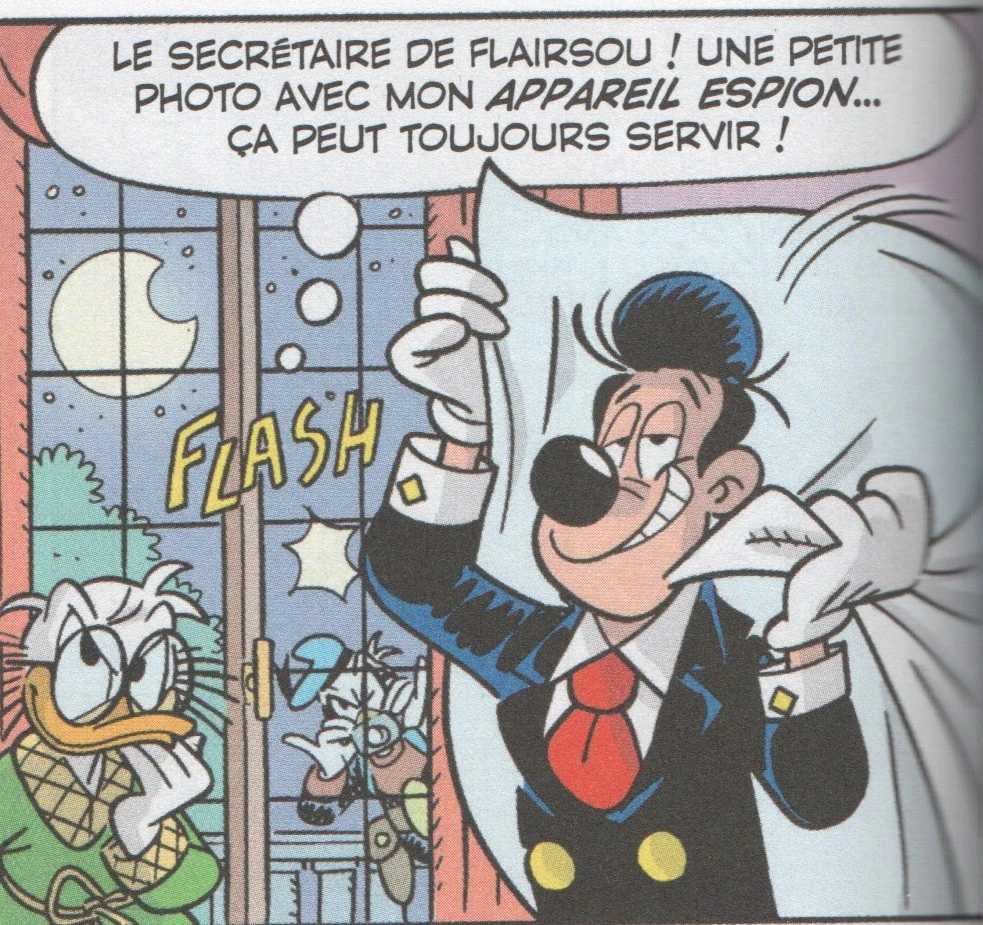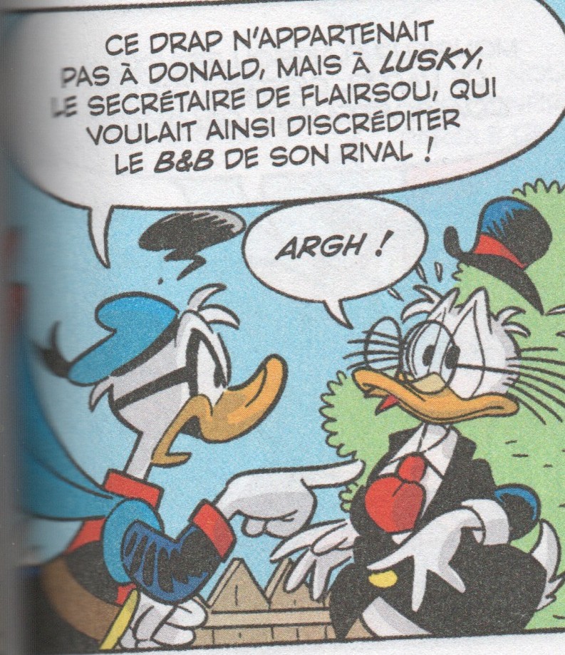 Le fantôme prend sa moto et se rend à la villa de John Flairsou. Il s'agit en fait de Lusky, le secrétaire de Flairsou. Fantomiald prend une photo de Lusky qui enlève son costume. Il rentre vite chez lui et cache son costume de Fantomiald dans sa voiture. Cependant, à l'entrée de la demeure, se trouve deux agents de police. En effet, Gontran a trouvé sous le lit de Donald le costume de fantôme. Donald est donc envoyé en prison.