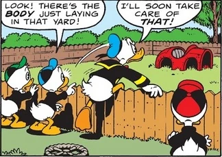 Le D.U.C.K. est caché sur l'illustration de Don Rosa pour son histoire, dans les éclats de verres en bas.
