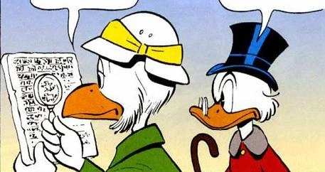 Picsou et le professeur Foude-Fouille observant une tablette à écriture cunéiforme.