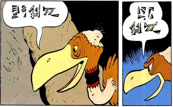 Ainsi, pour gagner en pittoresque, Carl Barks a décidé de retranscrire le vieux persan parlé par les rocs (oiseaux géants) en utilisant des caractères en simili-cunéiforme. Barks était d'ailleurs assez coutumier de cet artifice narratif, et utilisait fréquemment des caractères pseudo-étrangers pour simuler des langues exotiques, de l'arabe au vieux cathay (chinois).