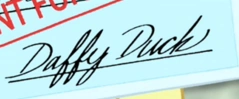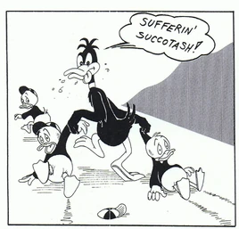 - ↑ Dans The Starstruck Duck, la femme du touriste qui demande un autographe à Donald est sûre qu'il n'est pas Daffy parce qu'il ne postillonne pas.