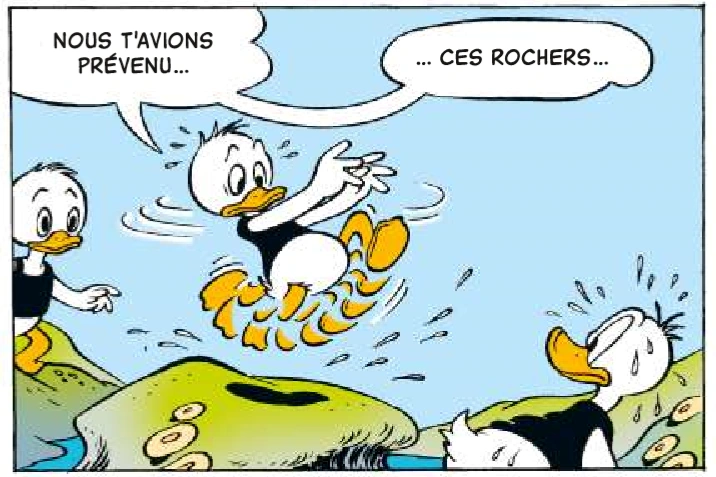 Le chemin pour rentrer commence mais les ennuis arrivent également : les canards glissent sur des rochers et atterrissent même sur des oursins. Si les enfants ont l'impression de ralentir, Donald propose de se laisser glisser sur une pierre en pente mais il finit dans une grotte sous-marine, obligeant les enfants à le secourir.