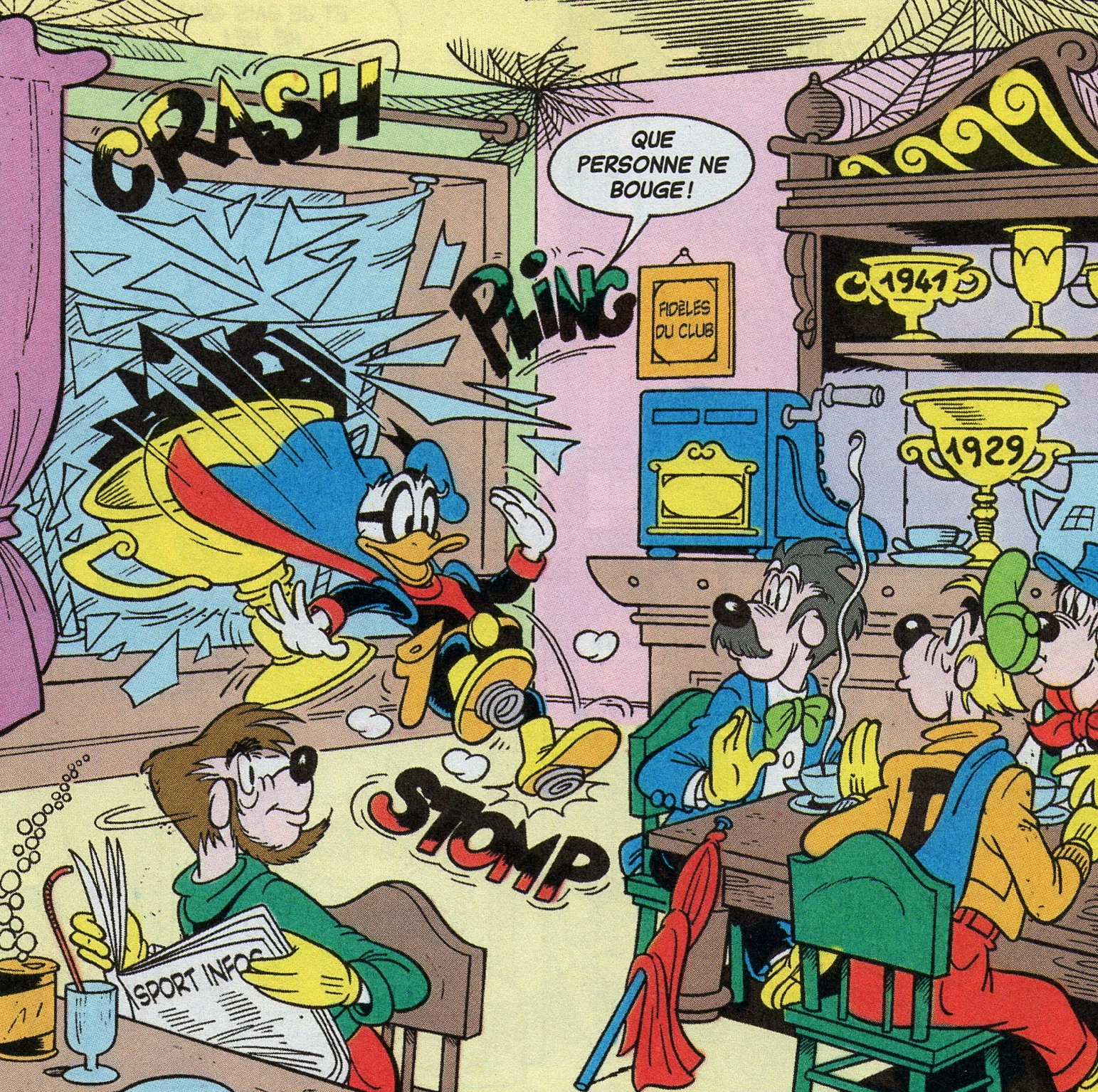 Le soir-même, Fantomiald se rend au bar où les supporters de Donaldville se réunissent. Croyant qu'il s'agit d'un supporter adverse déguisé en Fantomiald, les supporters commencent à se battre contre le super-héros mais ce dernier utilise ses nombreux gadgets pour les stopper, comme le poing en spray. Ce dernier demande alors pourquoi les supporters sont si violents dans les gradins. Le président du club Donaldville se présente alors à Fantomiald, lui expliquant que la plupart des dégâts causés par les supporters sont fait par des ultras et non par son petit groupe de supporters. Pour lui, il doit y avoir un sabotage pour faire perdre à chaque fois Donaldville. Il précise que la plupart des supporters sont de braves garçons et présente même plusieurs supporters au super-héros dont par exemple Swampy : bien qu'un peu simplet, il est la mascotte des supporters de l'équipe. Fantomiald se pose tout de même une question : certes, la plupart des supporters sont gentils, mais les projectiles viennent bien de leur secteur. Il doit mener l'enquête.