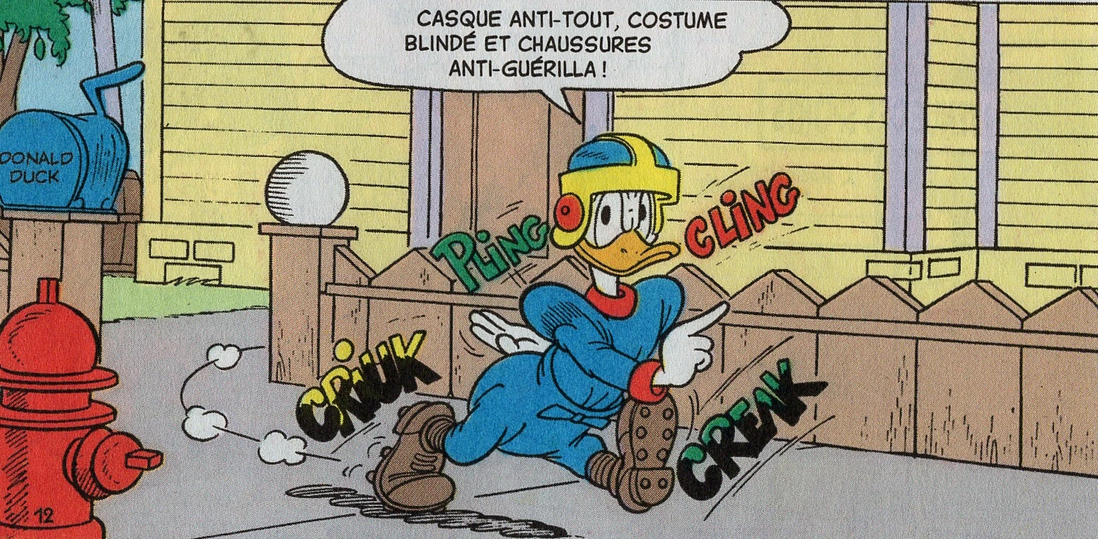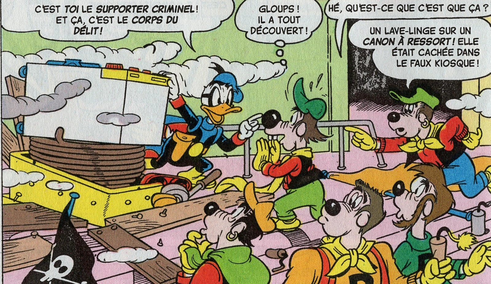 Le dimanche suivant, Donald a pris ses précautions et est équipé de la tête au pied pour assister au prochain match de Donaldville contre la Jumenrus. N'ayant plus de voiture, il se rend au stade à pied mais après une heure de match et équipé avec un énorme équipement, Donald est essoufflé lorsqu'il s’assoit dans le stade. Mais voilà qu'un coup franc est sifflé pour l'équipe adverse, équipe qui marque un but. Alors que les joueurs fêtent cela, un vélo est lancé des gradins et atterrit... sur l’arbitre ! Le match est de nouveau suspendu ! Pressentant que les joueurs de Donaldville vont se fâcher, Donald décide de partir. Mais voilà, les supporters se demandent d'où peut venir ce jet d'objet et accuse Donald car ils ne le connaissent pas et pensent qu'il a quelque chose à cacher. Donald prend vite ses jambes à son cou et s'enfuit, rencontrant au passage les supporters de l'équipe adverse. Ces derniers pensent alors que l'équipe de Donaldville vient les attaquer avec comme meneur Donald ! Une bagarre éclate alors. Pour Donald, c'en est trop, il faut remettre à leur place cette bande d'excités !