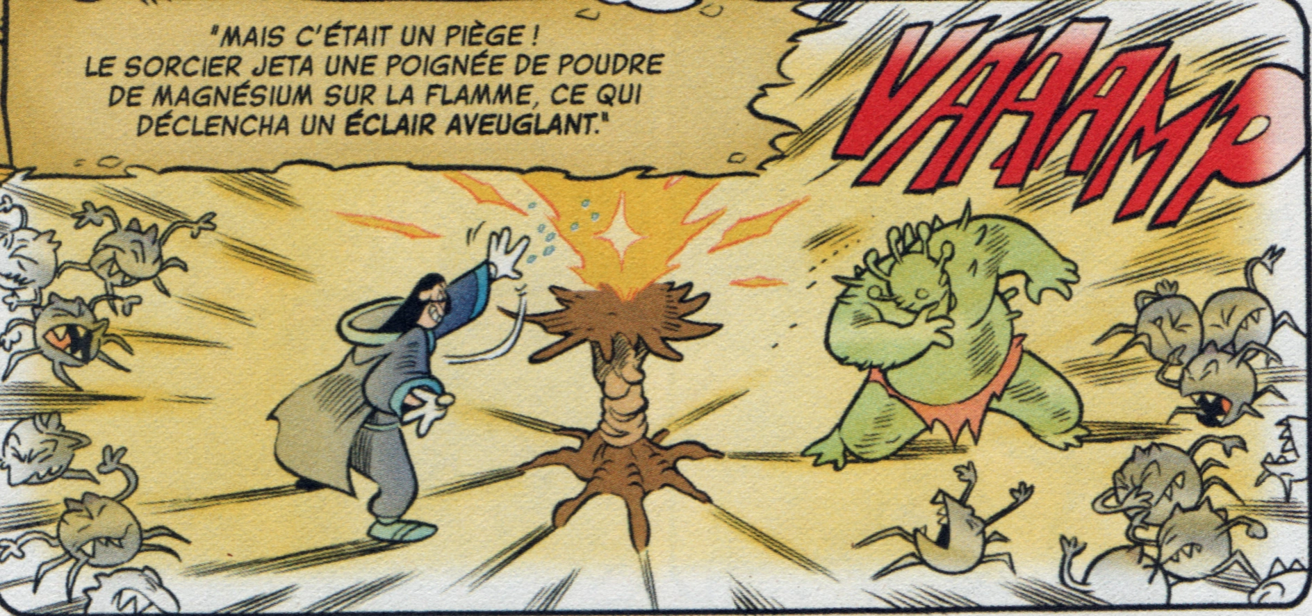 Le Seigneur des Mensonges trompant les Goulbads en jetant un éclair magique dans la flamme noire des brasiers de l'enfer.