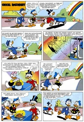 Donald et Gontran pensent que Picsou part chercher une marmite d'or au pied d'un arc-en-ciel, ce qui provoque chez eux l'hilarité...