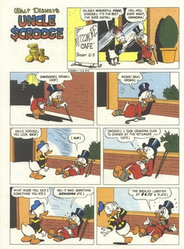 En sortant d'un restaurant, Picsou est malade et rencontre Donald, qui lui demande pourquoi il est malade. Son oncle lui répond alors qu'il a invité Grand-mère Donald au restaurant, et que c'est d'avoir payé le plat de Grand-mère à 4,75 $ qui le rend malade...