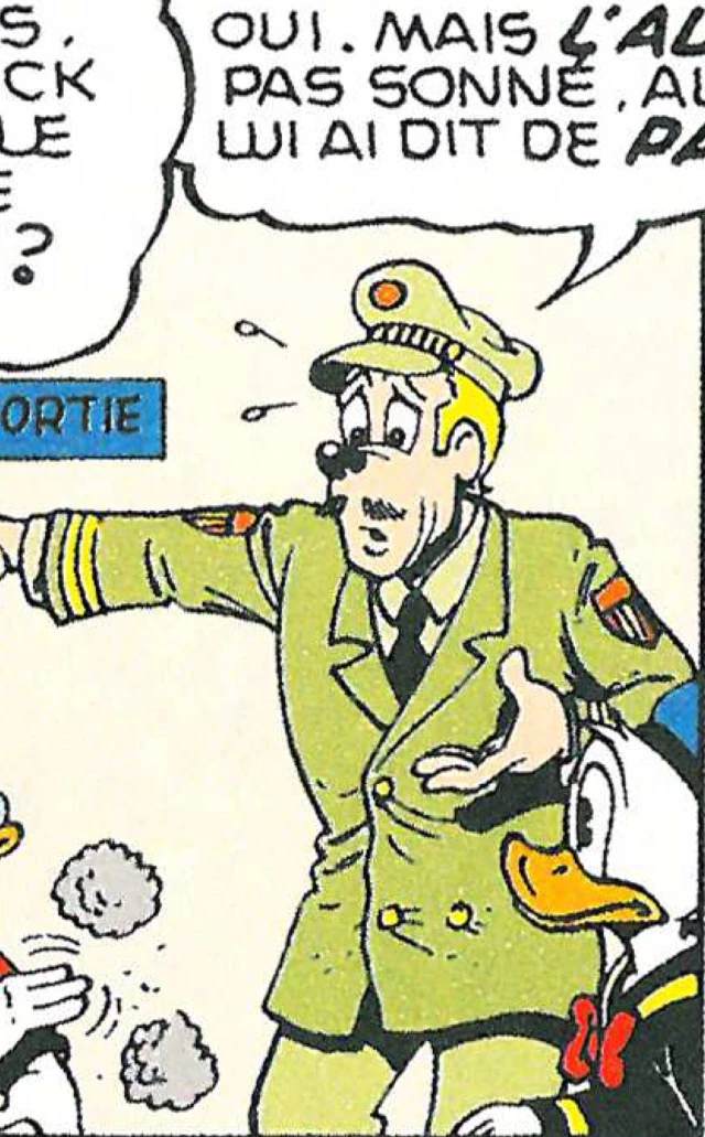 Vêtu d’une belle tenue de travail, il arbore une fine moustache. Il possède également un pistolet de service, dont il se servit pour menacer et arrêter six Rapetou qui avaient pénétrés dans le coffre. Il possède des « actions Picsou » qu’il a envisagé de vendre après avoir été témoin du comportement bizarre de Picsou et Donald, dû à un sortilège de Miss Tick.