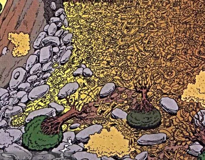 Malheureusement pour lui, le précédent propriétaire de la banque, Gripsou, se doutant bien que Picsou n'aurait pas racheté cette banque si elle n'avait aucune valeur, se lance à leur poursuite. S'engage alors une chasse au trésor qui les mènera au fameux Eldorado.