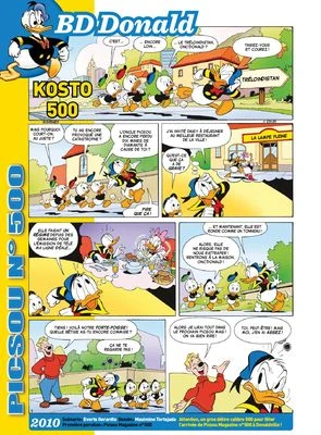 Kosto 500 est une histoire en bande dessinée de dix-sept planches, scénarisée par Evert Geradts, dessinée par Maximino Tortajada Aguilar et encrée par le Studio Comicup. Elle a été publiée pour la première fois le 9 avril 2010 aux Pays-Bas. Elle met en scène Archibald Gripsou, Basile, Bolivar, Boniface, Clarabelle Cow, Daisy Duck, Dingo, Donald Duck, Dumbo, Filament, Géo Trouvetou, Gontran Bonheur, Grand Chef, Grand Loup, Grand Mogol, Grand-Mère Donald, Gus Glouton, Gus et Jack, Hiawatha, Horace Horsecollar, Jack, Jiminy Criquet, Jojo et Michou Fieldmouse, José Carioca, Lagrogne, un Castor Junior, les frères Rapetou, Lili, Lulu et Zizi Duck, Madame Mim, Mickey Mouse, Mimi Lapin, Minnie Mouse, Miss Tick, les Trois Petits Cochons, Balthazar Picsou, P'tit Loup, Panchito Pistoles, Pat Hibulaire, Pluto, Riri, Fifi et Loulou Duck, Scamp et Tic et Tac. Elle se déroule notamment à Donaldville.