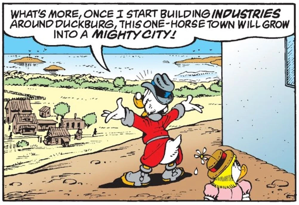 Picsou, en constatant l'état de Donaldville, annonce ses grands projets pour en faire le centre de son Empire.
