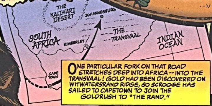 Une carte du Transvaal, à l'époque de la République sud-africaine, l'époque où Picsou se rend en Afrique du Sud.