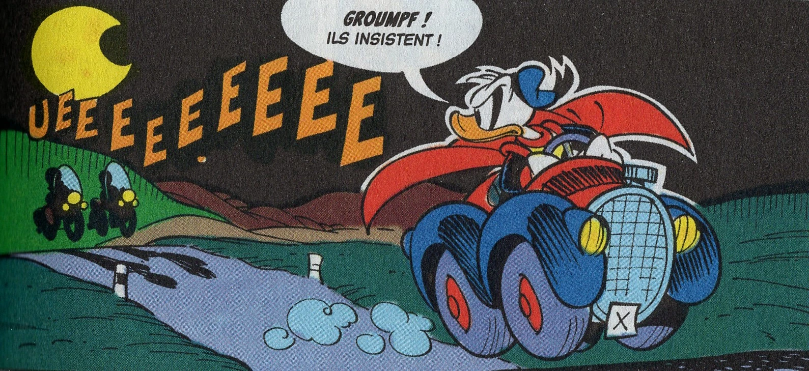 Ordonnant à ses neveux de rester dans leur chambre, Donald décide de passer à l’action et prend sa voiture pour se rendre près de cette étrange maison. Mais avant, il décide de s’arrêter en bordure de ville pour endosser son costume de Fantomiald. Ce qu’il ne sait pas, c’est qu’il n’est pas seul : ses trois neveux se sont cachés dans le coffre de sa fameuse 313 ! Prétextant une panne, Donald demande alors à ses trois neveux de pousser la voiture. C’est en réalité un piège et Donald réussit à les semer.