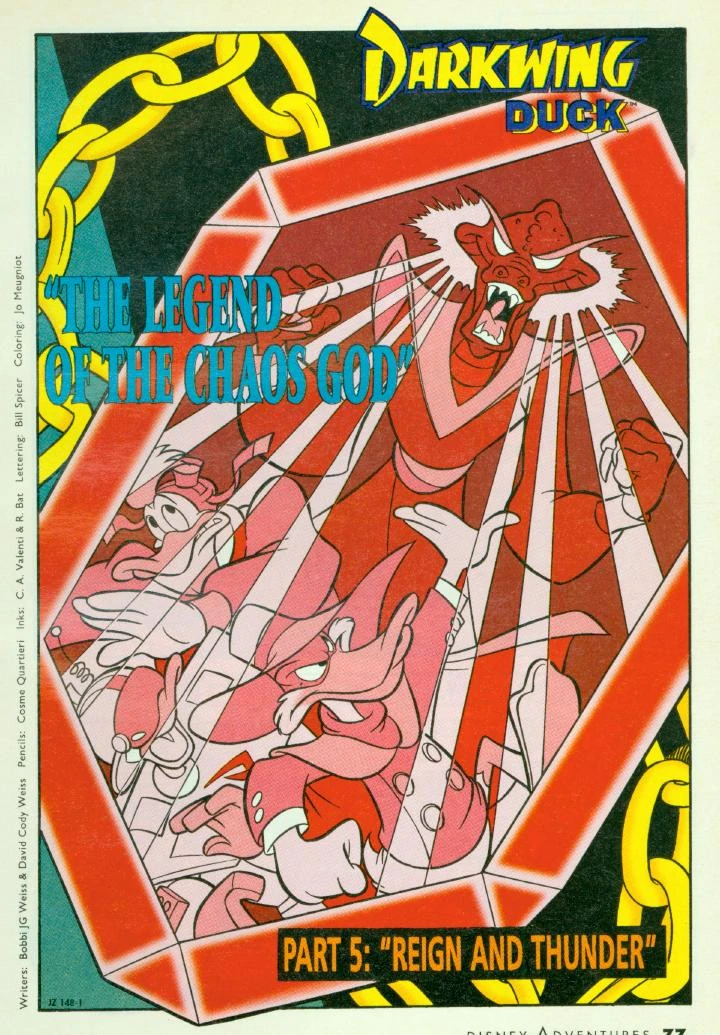 La légende du dieu du Chaos est une mini-série en cinq épisodes, qu'il est également possible de traiter comme une histoire chapitrée. Elle met en scène Balthazar Picsou, Riri, Fifi et Loulou Duck, Gérard Mentor et sa fausse identité Robotik, Flagada Jones, Myster Mask, Tic et Tac, Catox, Dingo, Pat Hibulaire, Max Dingo, « P.J. » Hibulaire, Peg Hibulaire, ainsi que Baloo, Kit Cloudkicker et Rebecca Cunningham de la série Super Baloo et les personnages créés pour l'occasion de Solego, sorcier maléfique se faisant appeler le Dieu du Chaos, et les professeurs Potsherd père et fils.