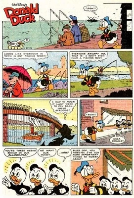 Pour les enfants, ce sera facile, et ils trouvent rapidement une canne à pêche résistante à l'eau, mais Donald aura plus de difficultés : Gontran lui prend son argent pour rembourser une dette, achète une canne à pêche, mais, grâce à sa chance, pêche un poisson et le donne à Donald.