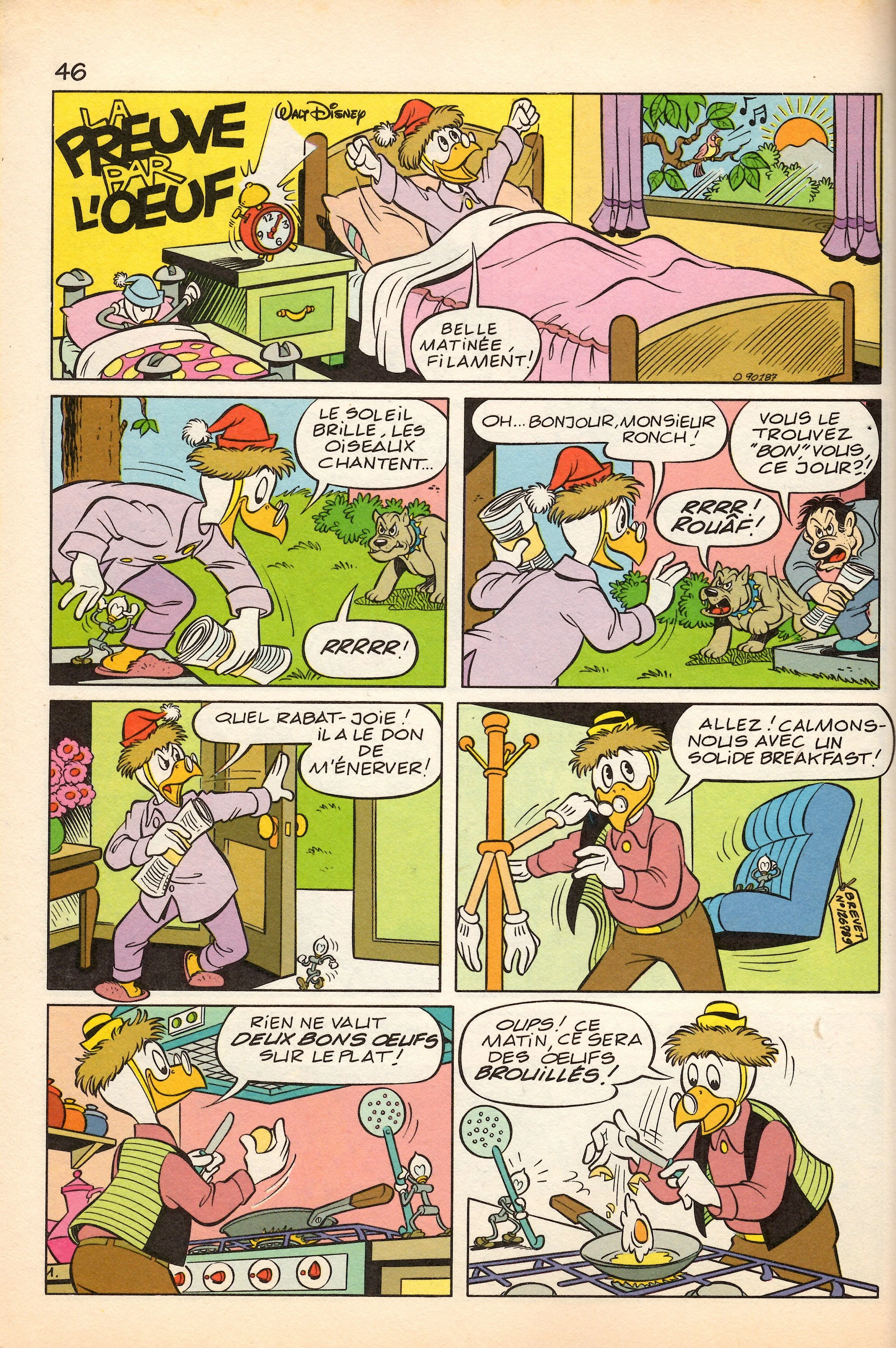 Le lendemain matin, Géo tente alors son invention. Mais voilà, la coquille est trop résistante et, en voulant la casser, il l'envoie chez son voisin en cassant l'une de ses fenêtres. Celui-ci vient d'ailleurs crier sa mauvaise humeur chez Géo. Mais l'inventeur ne laisse pas tomber et continue à plancher sur son invention. Ainsi, il tente de nouveau de casser des oeufs le lendemain. Malheureusement, les coquilles sont maintenant trop molles et il envoie en plus l'oeuf sur son voisin qui vient d'entrer chez l'inventeur pour lui présenter sa facture de réparation de la fenêtre cassée la veille.