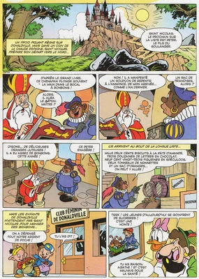 Alors que Donaldville est plongée dans le froid, en Espagne, Saint Nicolas termine ses comptes. Peter, le fils du boulanger, plonge souvent la main dans le bocal de friandises mais a manifesté un sempiternel soupçon de repentir, il n'aura donc pas de bâton mais un sac d'oranges. Tout est alors en place : les douze mille biscuits à la pâte d'amende, les les trois douzaines de lettres en chocolat, les neuf cent vingt-trois figurines en spéculoos, les deux tonneaux de nonnettes et le sac d'oranges.