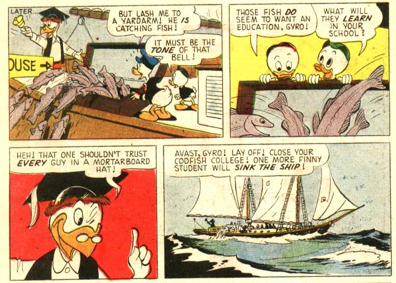 Dans la première case de la dernière page (voir ci-contre), Géo Trouvetou est le protagoniste d'un gag dont l'humour disparaît en traduction. Il repose en effet sur le double sens du mot anglais school , qui veut dire « école ». Mais a school of fish désigne un banc de poissons. Voilà pourquoi Géo réussit à attirer les poissons sur le bateau avec une toque et une clochette de maître d'école, laissant abasourdis Donald, ses neveux et... les lecteurs non anglophones qui ne risquent pas de comprendre le jeu de mots.