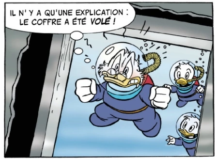 Balthazar Picsou et Riri, Fifi et Loulou Duck constatent le vol du coffre-fort du « Lucretia ».