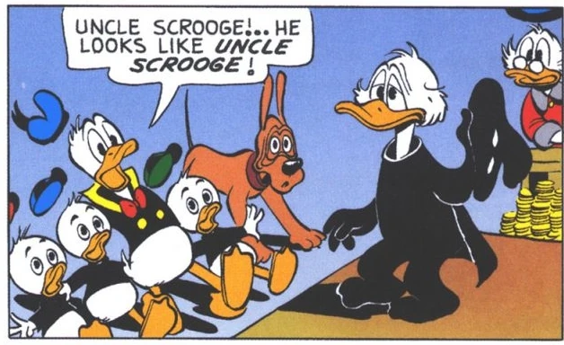 Sur les toits, l'oncle Picsou arrive enfin à apercevoir le fantôme de Notre-Duck. Mais il continue à s'enfuir, et Picsou essaye à nouveau de le suivre, mais, cette fois-ci, se fait piéger par le fantôme lui-même, et se retrouve suspendu à une corde fixée au toit de la cathédrale. Ses neveux tentent alors de le récupérer avec des coussins, pour éviter un accident.