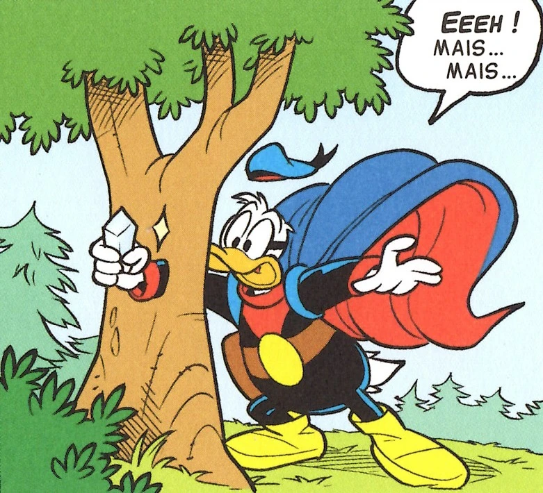 Pendant ce temps, dans la forêt, Fantomiald se réveille à côté d'un cristal, ne se rappelant plus du tout de ce qu'il s'est passé. Il se rend compte alors qu'il a été évanoui pendant plusieurs heures et que cela doit avoir un lien avec le cristal. Mais il se rend compte, en marchant dans un buisson, qu'il le traverse ! Il tente de toucher un arbre mais aperçoit son bras passé au travers. Le super-héros comprend qu'il est devenu immatériel mais qu'il parvient tout de même à toucher la pierre. Il se dit alors qu'il devrait aller voir Géo pour en savoir plus mais que sa voiture a été enlevée. Il se résigne donc à rentrer à Donaldville à pied.