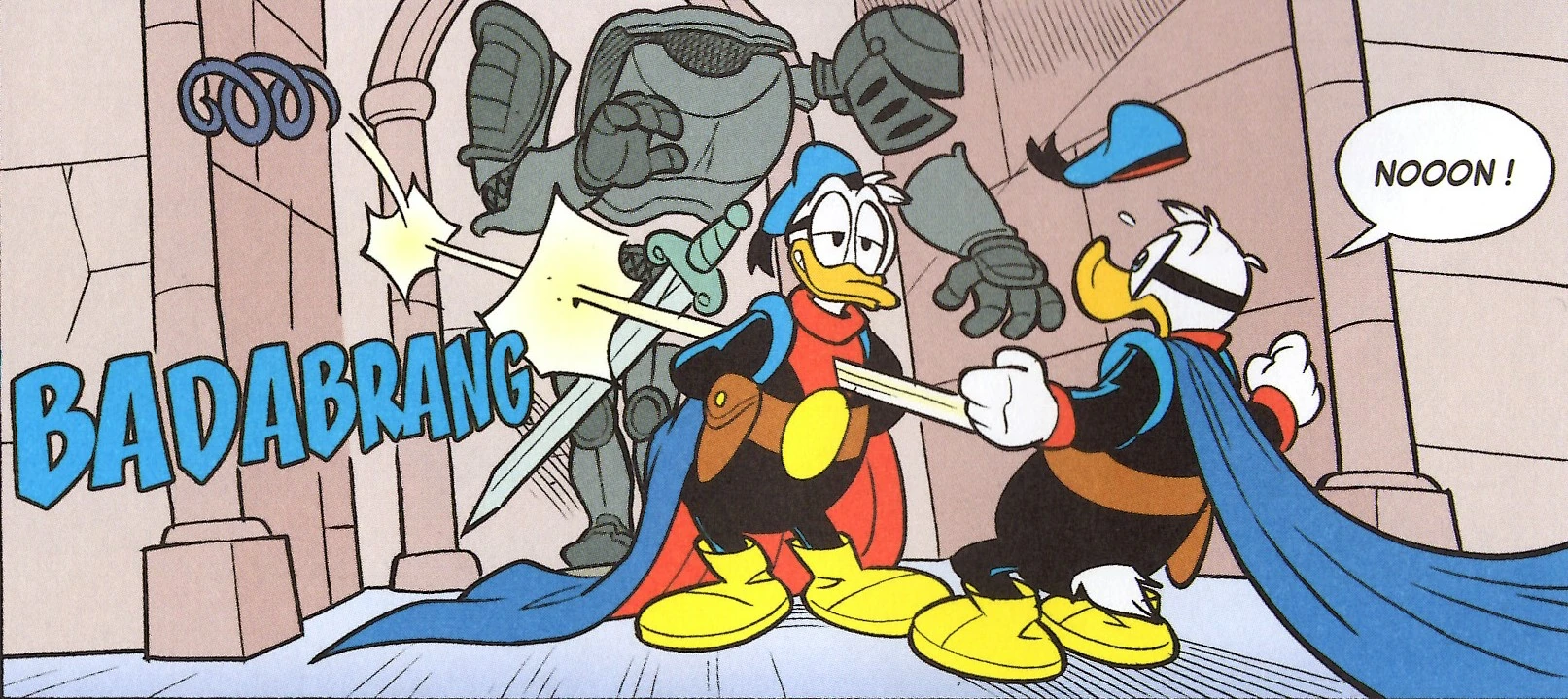 Un peu plus tard, dans un somptueux château non-loin de Donaldville où se déroule un gala organisé par un duc, le maléfique Fantomiald s'introduit avec fracas et commence à jeter du poil à gratter sur les invités. Heureusement, le vrai Fantomiald arrive, ce qui surprend son double maléfique. Ce dernier tente de lancer un rayon paralysant sur son ennemi mais il n'est pas touché car son corps est immatériel. Le vilain Fantomiald tente alors de jeter un ressort électrique sur Fantomiald mais le ressort touche une armure se trouvant derrière lui qui s'écroule sur lui. Profitant qu'il soit hors d'état de nuire, Fantomiald fait toucher la pierre à son double, provoquant un nouvel aura de lumière.