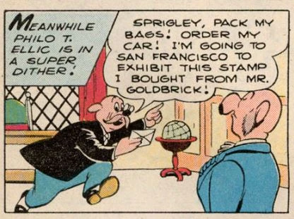 Monsieur Goldbrick est cité dans l'histoire de Carl Barks Les timbrés du timbre, datée de septembre 1952.