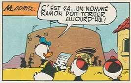 Madrid est la capitale de l'Espagne. Un jour, Donald et ses neveux durent y aller, alors qu'ils étaient à la recherche d'un diamant pour leur oncle Balthazar Picsou. En effet, celui-ci avait acquis le diamant grâce au radjah Rah-Rah, celui-ci lui ayant donné la pierre à cause des Rapetou qui voulaient s'en emparer. Le milliardaire, en ayant eu le diamant, était poursuivi par les bandits. Il dut donc cacher le diamant quelque part, et proposa plus tard à Donald de le chercher là où il l'avait caché, à l'insu des Rapetou, en suivant une série de rébus et de messages codés. C'est ainsi qu'ils allèrent au Caire, où Donald eut un appareil photo. Sur la pellicule de cette appareil, il était indiqué que les canards devaient prendre l'avion de 12 heures 45 à direction de Madrid. Dans cet avion, l'hôtesse de l'air donna des serviettes à Riri, Fifi et Loulou où étaient dessinés des taureaux, et donna une serviette à Donald où était écrit le prénom Ramon. Les canards en déduisirent donc qu'il fallait qu'ils aillent rencontrer un torero nommé Ramon.