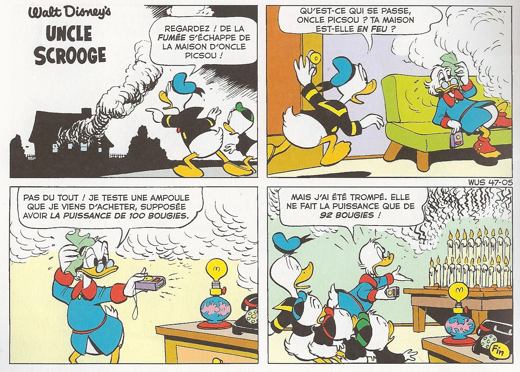 Donald et ses neveux voient de la fumée qui s'échappe de la maison d'Oncle Picsou. Ils vont voir mais Picsou explique, en leur montrant des dizaines de bougies alignées sur une table, qu'il testait une lampe ayant la puissance de cent bougies, mais qu'il s'était fait avoir car elle ne faisait que la puissance de quatre-vingts-douze bougies.