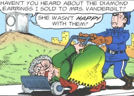 C'est une très riche femme. Elle a acheté quelques-uns des diamants extrapurs ramenés à la surface de la Terre par le dissolvant universel de Géo Trouvetou; comme ces diamants sont très denses, ils sont également très lourds, et Mme Bijounette est incapable de supporter le poids de ses boucles d'oreilles.