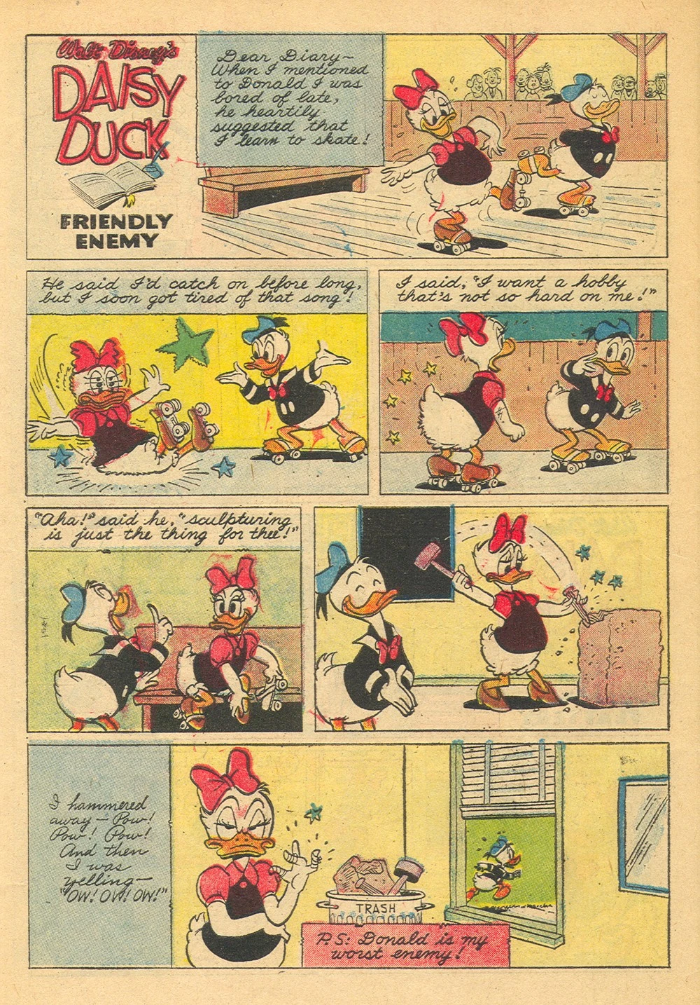 Daisy confie à Donald qu'elle s’ennuie et qu'elle ne sait plus quoi faire pour occuper son temps. Il lui propose alors de lui trouver un hobby. Donald lui suggère d'apprendre le patin à roulette, mais elle tombe immédiatement et décide de passer à un hobby plus tranquille. Alors, son fiancé lui propose la sculpture, mais travaillant de marteau et ciseaux, Daisy se blesse plusieurs doigts. Réfléchissant, Daisy se convaincs de plus en plus que Donald est son pire ennemi.