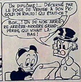 - ↑ Ce fait est étonnant, car dans l'histoire Don Picsoldi de Venise Picsou dit clairement que Picsoldi était son arrière-arrière-arrière-grand-père.