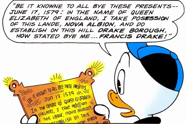 Une plaque de cuivre retrouvée dans une souche près du coffre de Picsou prouve que le marin britannique Francis Drake fut le premier à découvrir les rivages du futur Calisota, au nord de la Californie. Il baptisa ces terres Nova Albion en hommage à sa reine – Albion étant un des noms de l'Angleterre. C'était en 1579.