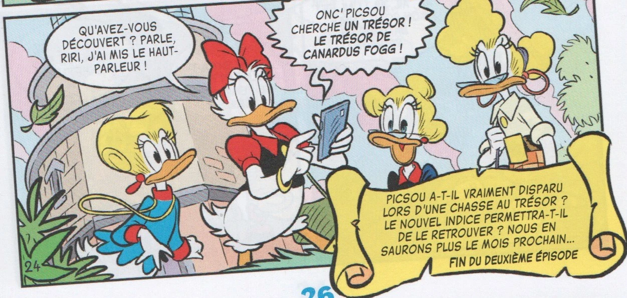 Riri appelle Daisy pour leur annoncer que Picsou est à la recherche du trésor de Canardus Fogg.