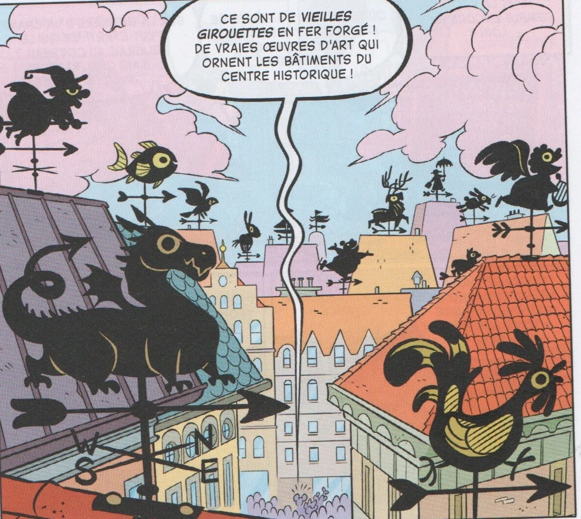 Mickey, Dingo et Minnie sont à Canford. Après être passé au commissariat de police pour savoir si Picsou avait été aperçu, où ils ont obtenu une réponse négative, ils remarquent que les touristes lèvent tous les yeux en l'air. Ils observent alors de vielles girouettes en fer forgé de différentes formes. Ces girouettes font la célébrité de la ville. Dingo se rappelle alors que sur la carte de Canardus Fogg se trouve une girouette dessinée à coté du nom de la ville. Nos amis sont suivis de près par un Rapetou et Savantissime. Mickey, Dingo et Minnie cherchent à savoir laquelle de ces girouettes est l'indice, tout comme les deux Rapetou. Mickey a alors l'idée de louer une montgolfière pour avoir une vue d'ensemble.