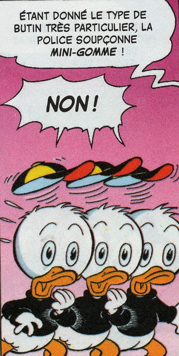 Quelques jours plus tard, l'ambiance n'est plus la même chez Picsou. En effet, un de ses secrétaires a dû se sacrifier pour lui annoncer l'horrible nouvelle : les entrepôts de Picsou ont été dévalisés de tous les chewing-gums ! Chez Donald, la nouvelle est également arrivée et de plus, les jeunes canetons apprennent que le principal suspect est... Mini-Gomme ! Ils savent bien que l'extra-terrestre est innocent et se jurent de tout faire pour l'innocenter. Mais déjà de nombreuses affiches sont placardées en ville. En s'approchant de l'une d'entre elles, Riri, Fifi et Loulou découvrent qu'en fait il s'agit de Mini-Gomme lui-même qui a utilisé ses pouvoirs pour se cacher dans l'affiche.