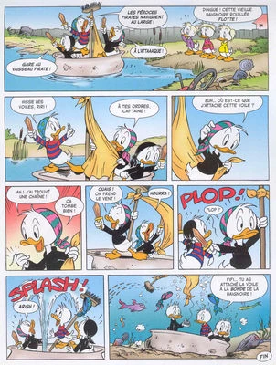 Riri, Fifi et Loulou jouent aux pirates, utilisant une vieille baignoire comme navire et un balai pour mât. Ne sachant pas où accrocher la voile suspendue au balai, un des garçons utilise une chaîne au sol... Qui n'est autre que celle de la bonde ! Avec le vent, celle-ci se soulève, et le « navire » coule avant que les neveux n'aient le temps de réagir.
