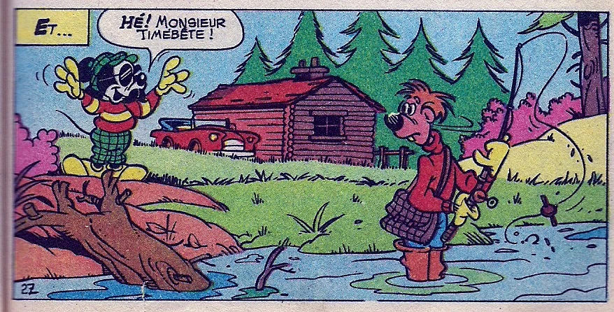 Jean Timébête pêchant le saumon au bord de la rivière Couaille avant d'être appelé par Mickey Mouse déguisé.