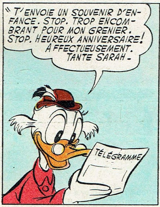 Sarah est la tante de Balthazar Picsou. Elle envoya un télégramme à son neveu pour son anniversaire, accompagné d'un colis contenant un souvenir de l'enfance de Balthazar, devenu trop encombrant pour son grenier, et dont elle ne voulait plus payer les charges de stockage. Il s'agissait de la tirelire géante de son enfance sur laquelle est marqué : « Les petits sous font les grosses fortunes. »