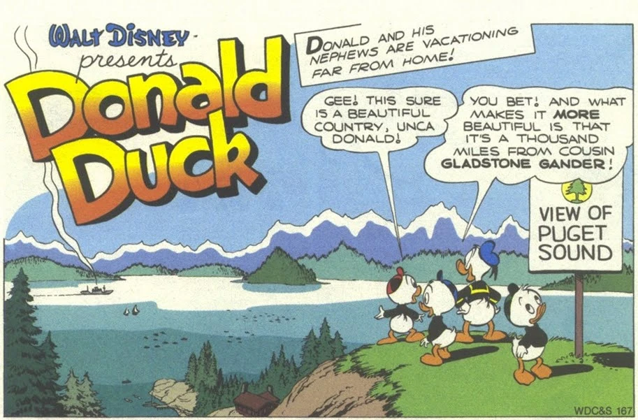 Cette histoire, réalisée pour Walt Disney's Comics and Stories , est la première de Barks commençant par un splash panel , c'est à dire une grande case d'ouverture occupant la moitié supérieure de la première page. À cette occasion, l'auteur en profite pour présenter une vue de Puget Sound , un bras de mer relié à l'océan Pacifique par le détroit de Juan de Fuca, dans l'État de Washington. C'est sur le Puget Sound que se trouvent entre autre les villes de Seattle, Olympia et Tacoma.