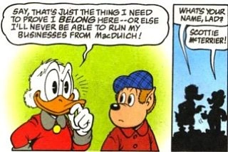 Scottie McTerrier était en quelque sorte un ami de jeunesse de Balthazar Picsou. Il était encore enfant lorsque, en 1902, le prodige local revint d'Amérique. Afin de redorer son blason auprès des locaux, Picsou désira entrer en compétition dans un concours de sports des Highlands, et il put compter sur le soutien du jeune Scottie.