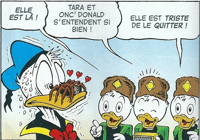 Selon Riri, Fifi et Loulou, Tara s'évade souvent de sa petite cage pour retrouver leur oncle Donald qu'elle aime beaucoup (ce qui n'est pas vraiment réciproque).