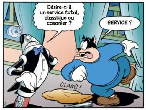 Plus tard, Pat Hibulaire décide de cambrioler Dingo après avoir appris qu'il y a désormais du matos électronique. Le bandit rentre alors par la fenêtre et est accueilli par le robot majordome qui traite Pat de la même manière que Dingo. Et à la question du service, Pat ne réfléchit pas et répond total. Le majordome soulève alors Pat et l'amène dans la baignoire, étant donné qu'il n'a pas pris de bain depuis dix jours et que cela se sent à l'odeur. et après ce bain, des femmes-robots lui font un soin total, entre manucure, rasage, brushing et massages. Le cuisinier viendra le chercher pour dire que le repas grosse faim totale demandé par Dingo avant son départ au restaurant est prêt.