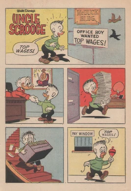 Picsou fait passer une annonce pour un poste de garçon de bureau en stipulant que ce travail est un jeu d'enfant. Un garçon prend le poste et, à la fin de l'histoire, gagne une toupie en guise de salaire et s'exclame : « La paye aussi est un jeu d'enfant ! » .