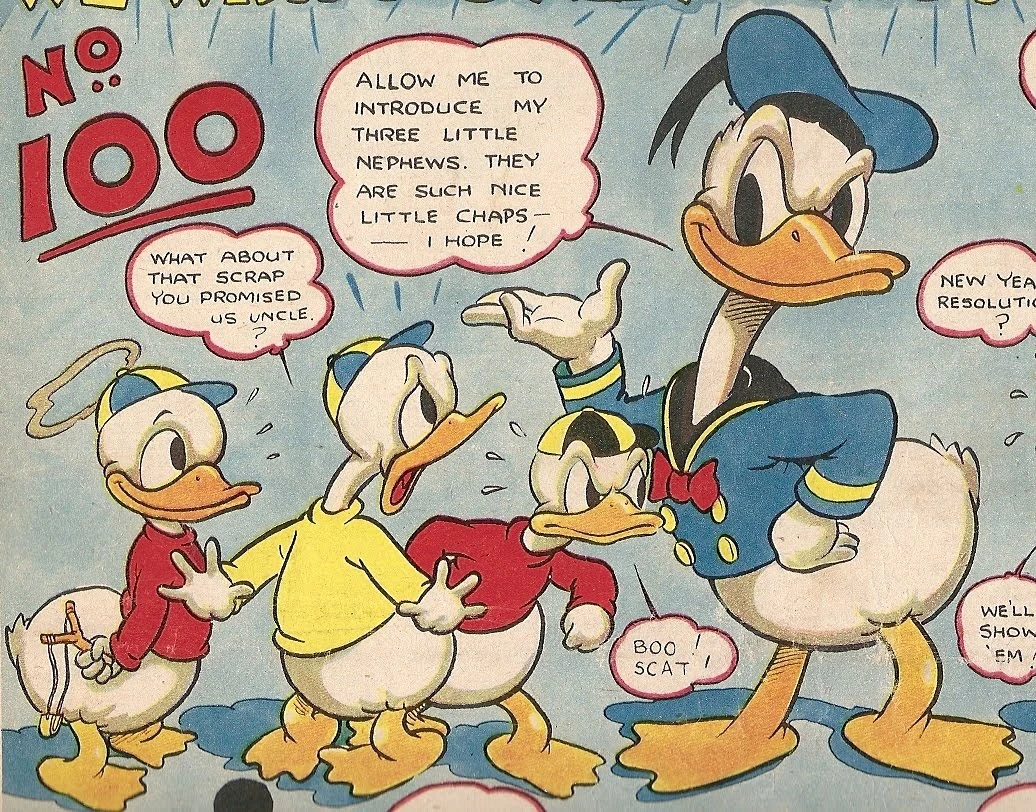 Dessin de Wilfred Haughton représentant Donald Duck et ses neveux Riri, Fifi et Loulou Duck.